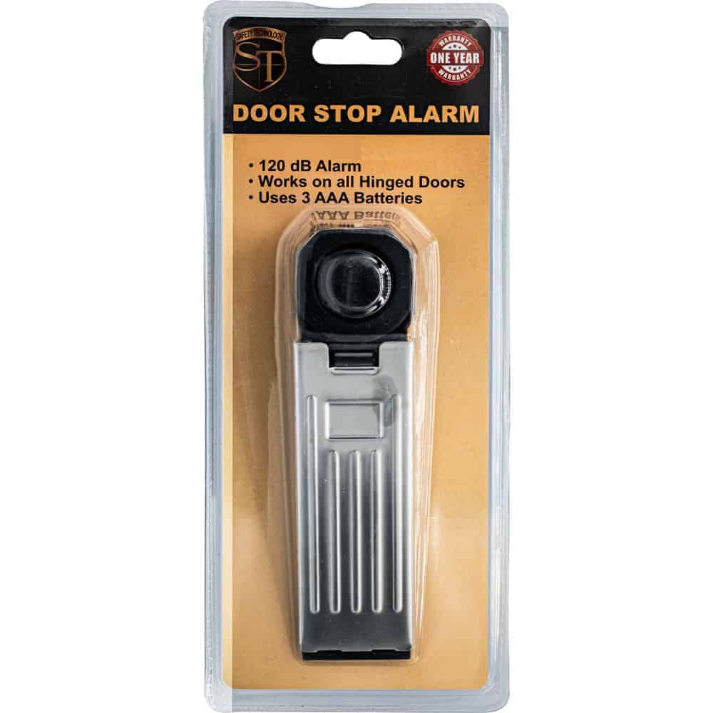 Use the DOOR STOP ALARM as an entry alarm and to block a door from being opened. If anyone tries to open the door, this 120dB alarm will sound. Alarm stops when pressure is released from door stop plate. There is also a movement sensor that will activate the alarm if it’s tampered with. On/off switch is on the back of the alarm and includes a low battery indicator light. Uses one 9-volt battery (not included). Measurements 6 3/8" x 1 3/4"